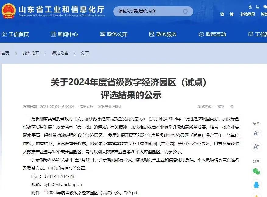 近日,山东省工业和信息化厅发布《关于2024年度省级数字经济园区(试点)评选结果的公示》,沂蒙云谷智慧产业园成功入选2024年度省级数字经济园区(成长型),全市唯一。